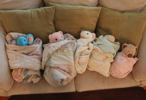 Their swaddling skills are also amazing! I found these stuffed animals nicely swaddled and cozy on the couch the other night and had to take a picture.