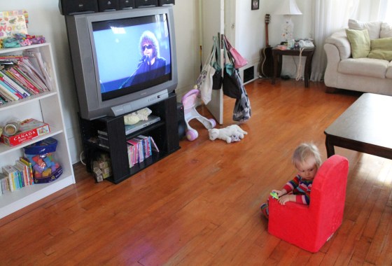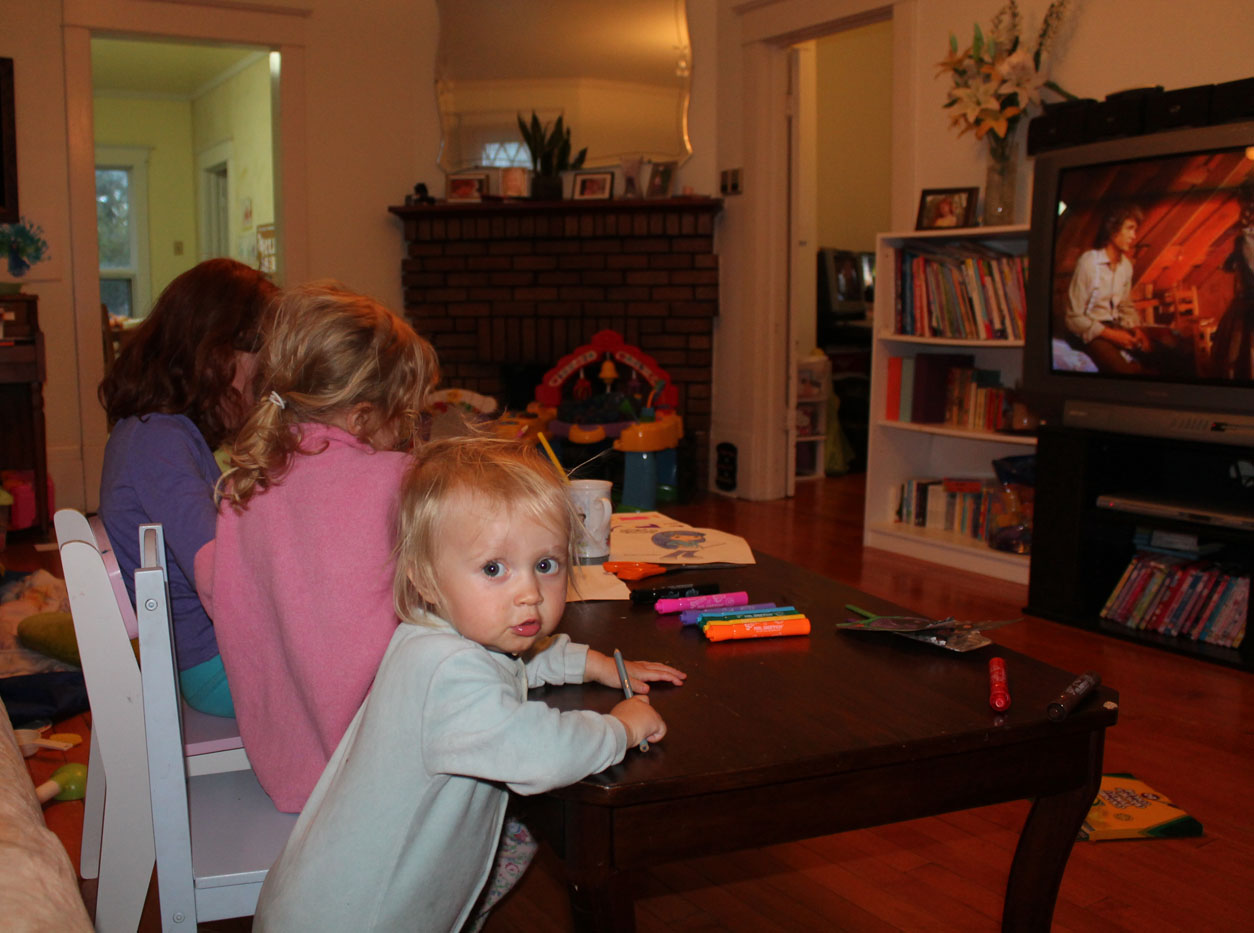 This picture is of the girls doing crafts at the living room table while watching Little House On The Prairie. Serafina is sneaking a taste of a pencil crayon.