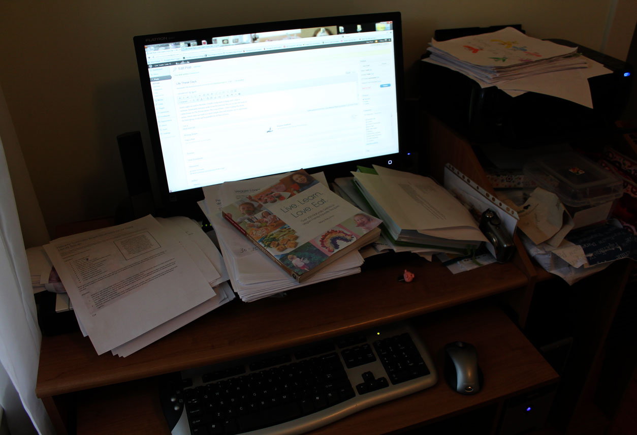 This is a picture of my messy desk where I spend much of my day working on the cookbook and write my blog posts. I want to remember this because maybe one day soon it will actually be neat and organized.