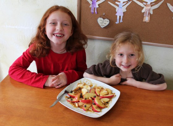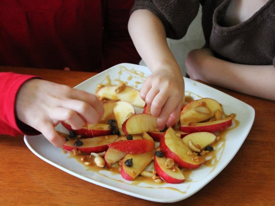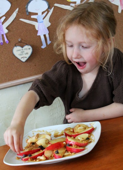 This afternoon I felt like surprising my girls with a sweet (but healthy) treat so I made them a plate of apple “nachos” to share.