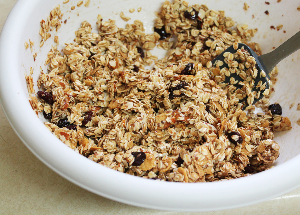 I was thinking that I would try making a no-bake granola bar recipe that included my new favorite cereal. Instead of regular old granola bars, I also decided last minute that putting the granola mixture into baking cups and freezing them would make for handy nutritious snacks. Plus, we are always snacking on frozen cookies anyway since we enjoy them so much.