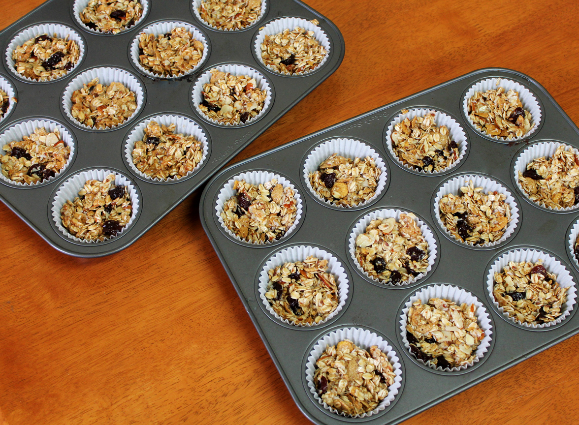 6. Spoon the granola mixture into each baking cup, filling them each 3/4 of the way full. Repeat to make 24. Press the mixture down with the back of the spoon to pack it into the baking cup.