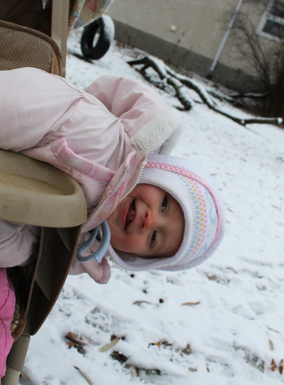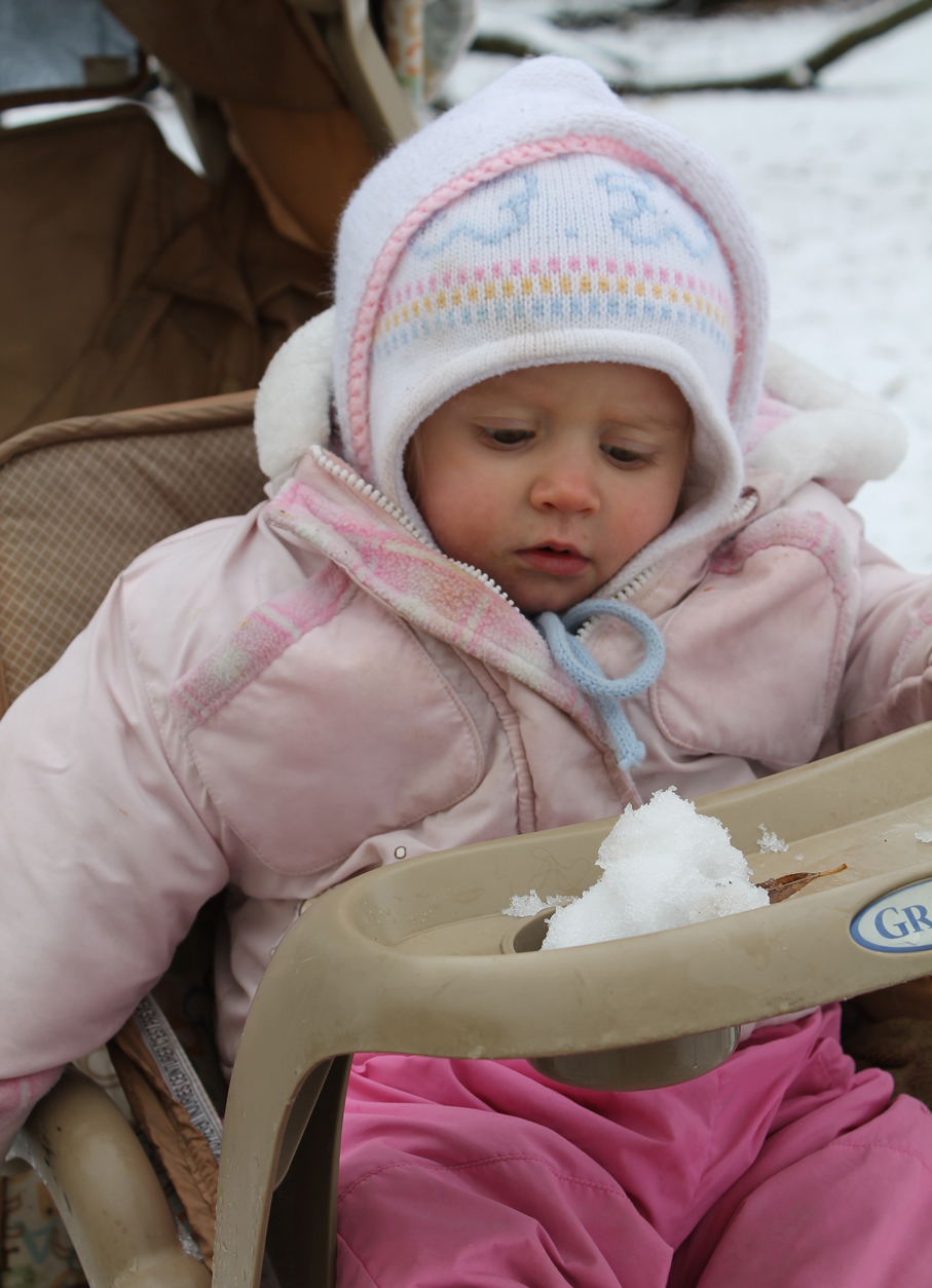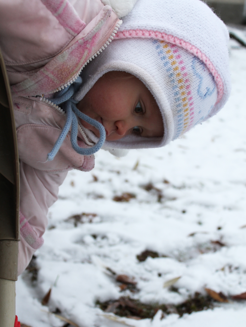 We got a little bit of snow last night. Not enough to stay, but enough to excite the girls and get them to beg to go and play outdoors. We took a nice slushy walk in the morning and then they enjoyed playing in the yard.