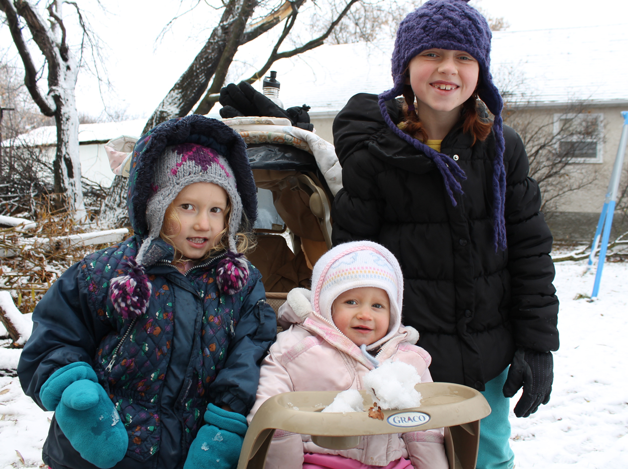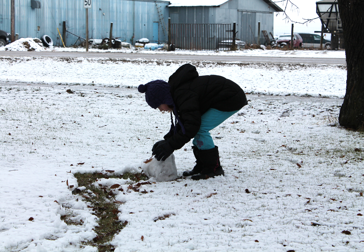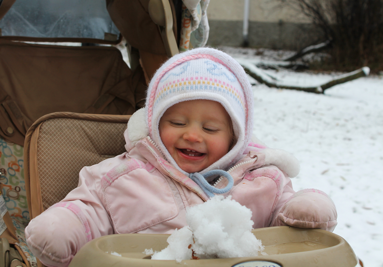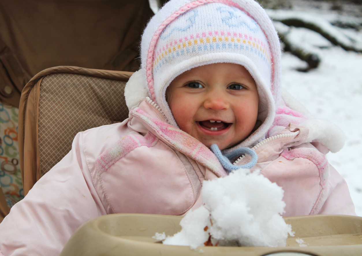 We got a little bit of snow last night. Not enough to stay, but enough to excite the girls and get them to beg to go and play outdoors. We took a nice slushy walk in the morning and then they enjoyed playing in the yard.