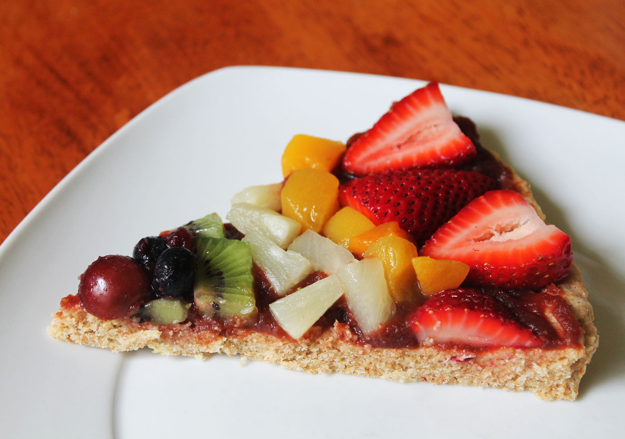 This recipe makes a great spring or summer dessert. The crust is made with whole wheat flour, the ‘sauce’ is apple butter and the toppings are a rainbow of fresh fruit! My kids even like to have this fruit pizza for breakfast.