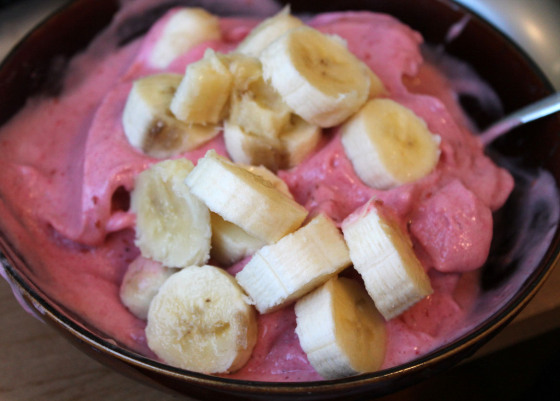 Blend up frozen bananas with a splash of unsweetened almond milk to make banana soft serve. Add fresh or frozen raspberries, strawberries or mangoes to make a different fruit flavor or a few tablespoons of cocoa powder for a chocolatey treat!