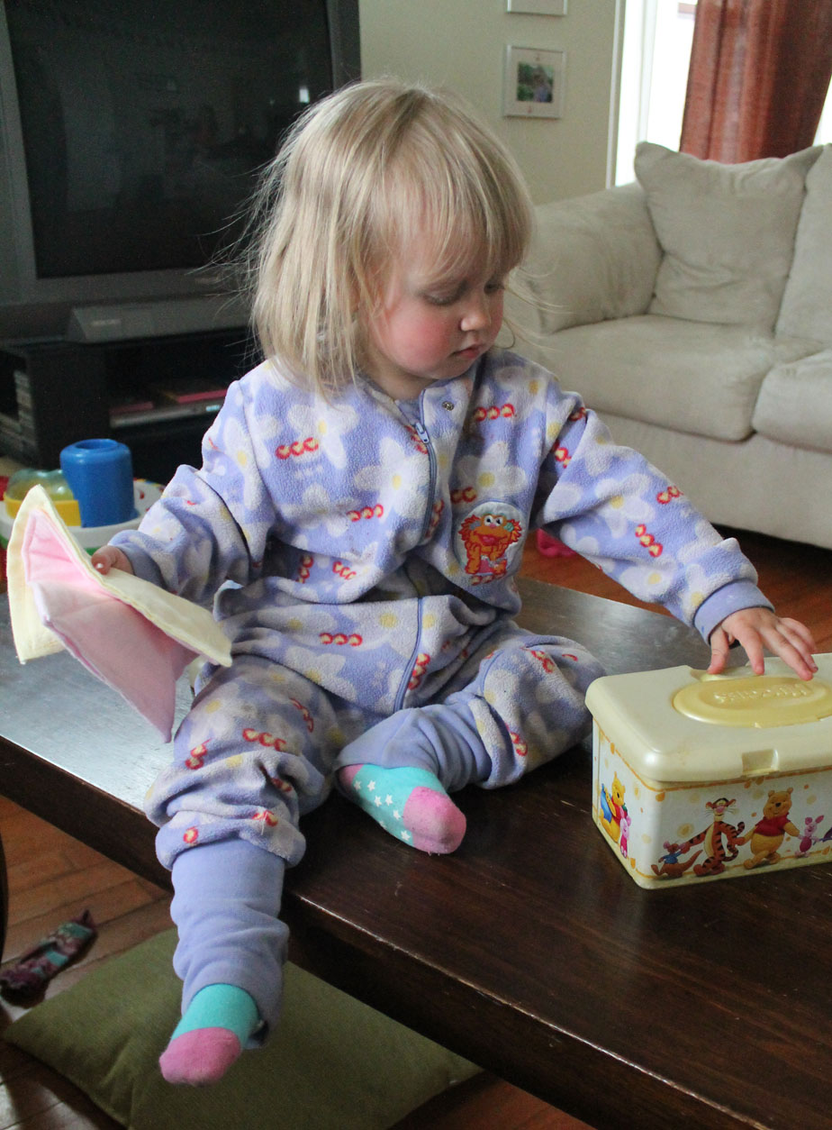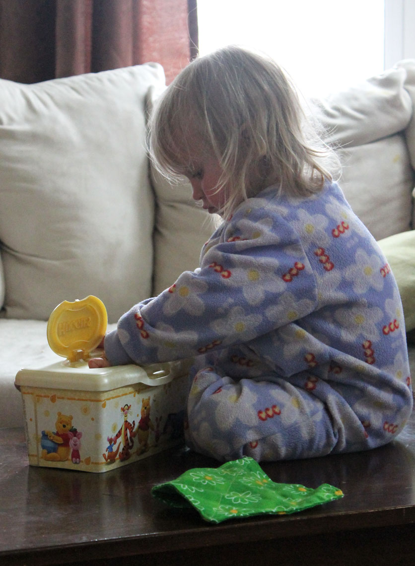I had seen this craft on pinterest for making squares of fabric and stuffing them into a wipe container for babies and toddlers to play with. I thought that would be great for Serafina!
