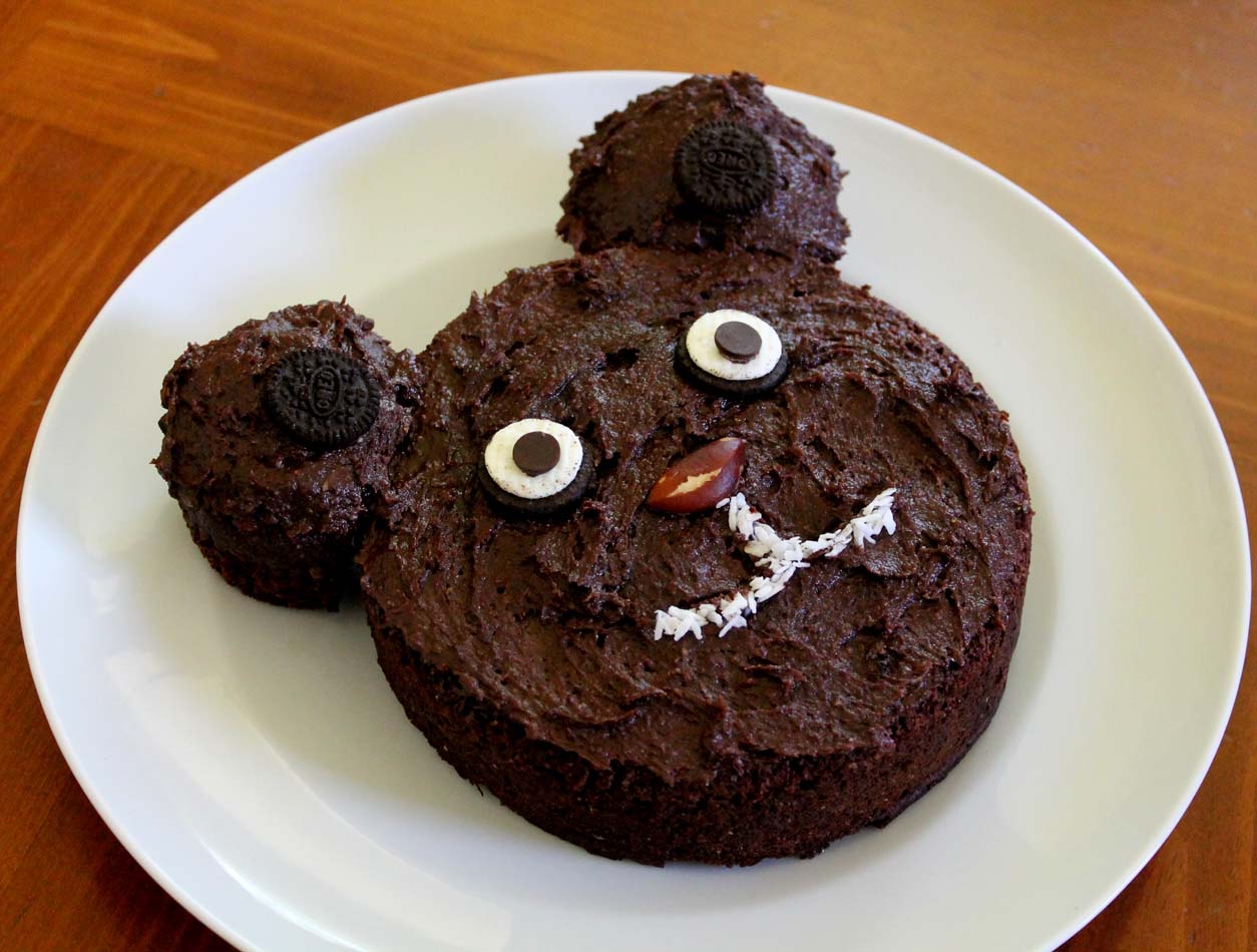 For her cake I decided to make a small bear cake using my recipe for chocolate banana cake with homemade chocolate frosting. I made some cupcakes for the bear ears and used mini oreos and carob chips for the eyes, a Brazil nut for the nose and shredded coconut for the mouth.