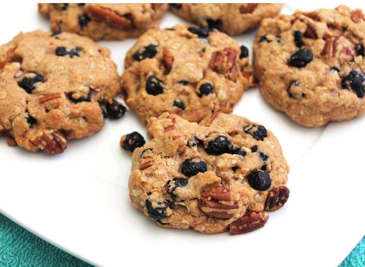 On my search in the grocery store for some dried apricots to make Coconut Apricot Cookie Granola, I came across dried blueberries. I have never had dried blueberries before in my life and I immediately thought of throwing them into an oatmeal cookie recipe. Scanning the baking aisle shelves for pecans, I knew already in my mind that I had just invented an awesome recipe.