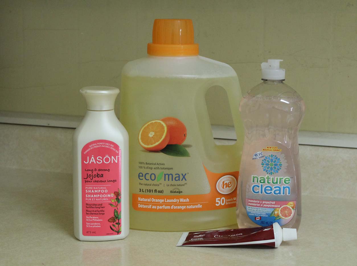 Eco-friendly toothpaste (Green Beaver), shampoo (Jason), laundry soap (eco-max), and dish soap (nature clean). All products are natural and free of potentially harmful ingredients.