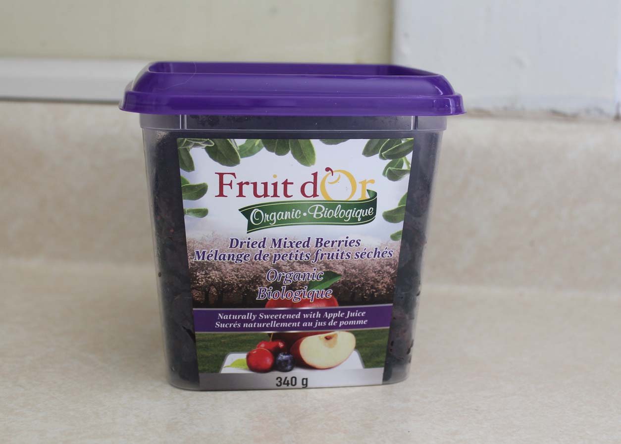 I found these fruit juice-sweetened dried mixed berries and also cranberries at our grocery store in town. They are so fresh and perfectly sweetened with fruit juice instead of refined sugar. They also do not have oil in them! These are great for snacking on or for using in recipes.