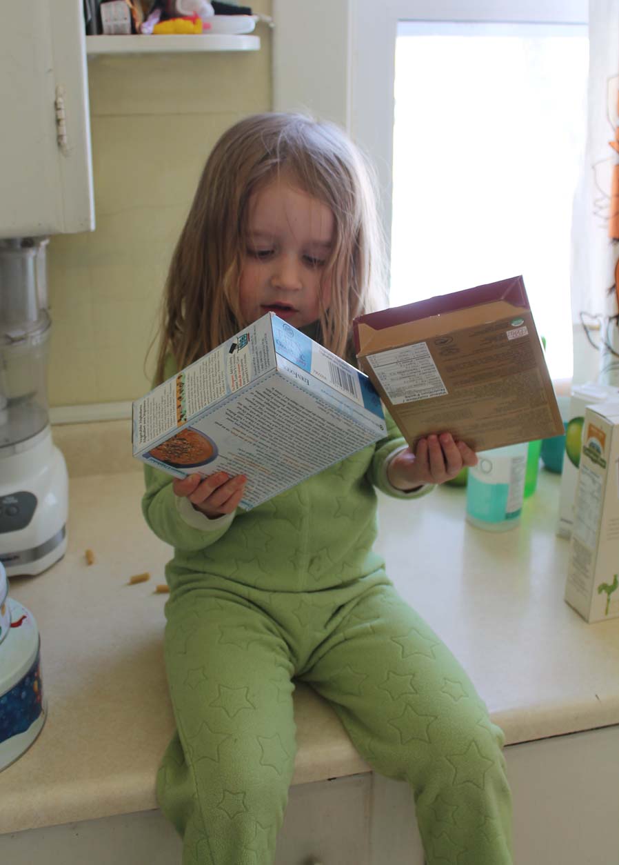The girls love to eat pasta, so I try to buy pasta in different shapes and made with different types of grains to change things up. They especially love vegetable kamut rotini. Plain pasta is one of Serafina’s favorite foods of all time.