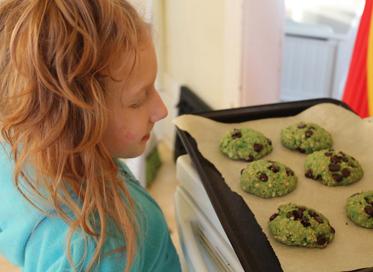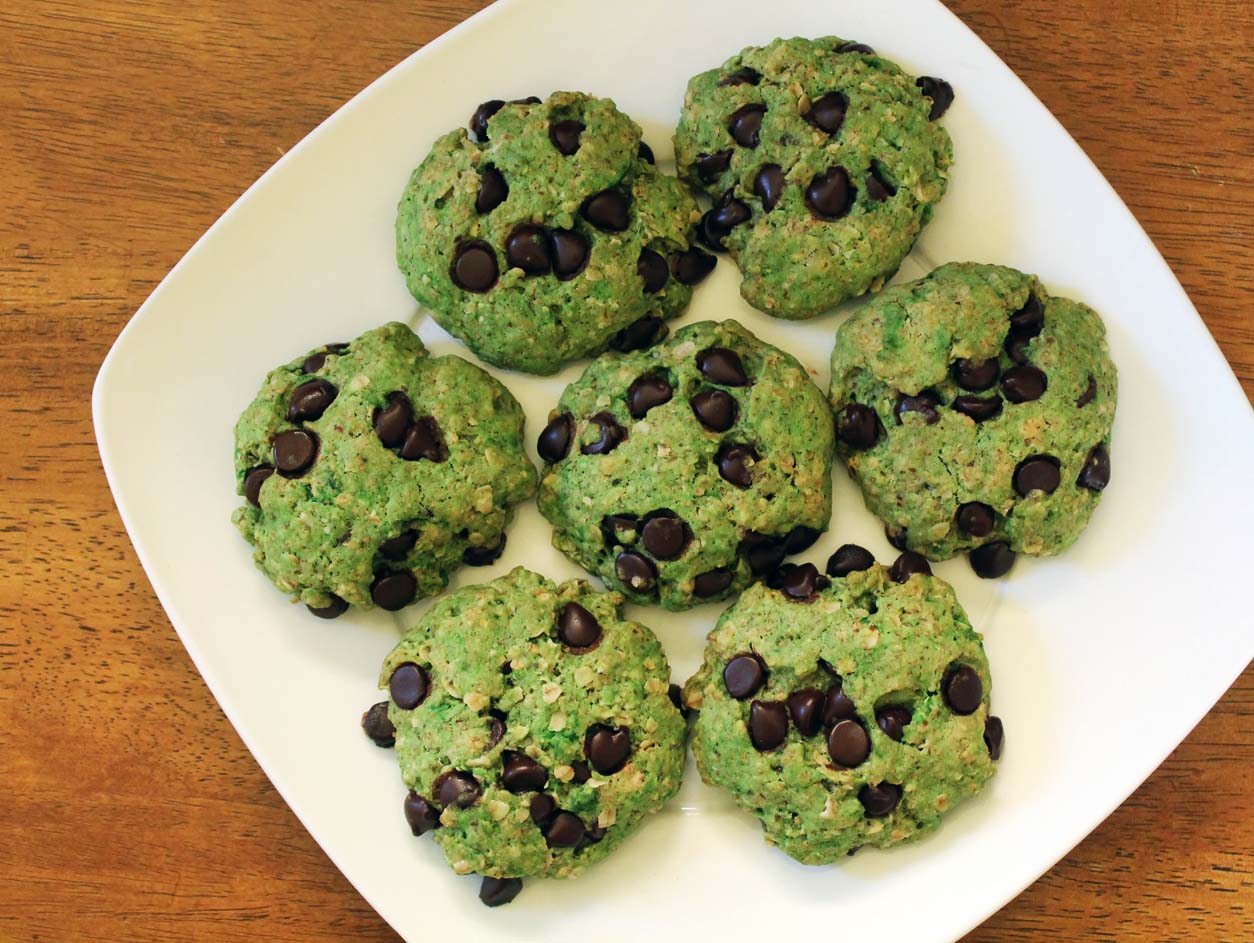 These cookies are a perfectly healthy Saint Patirck’s day treat, made with spelt flour, oats and ground flax seed, and sweetened with pure maple syrup and sugar-free Krisda chocolate chips! Omit the green coloring if making as an everyday recipe.