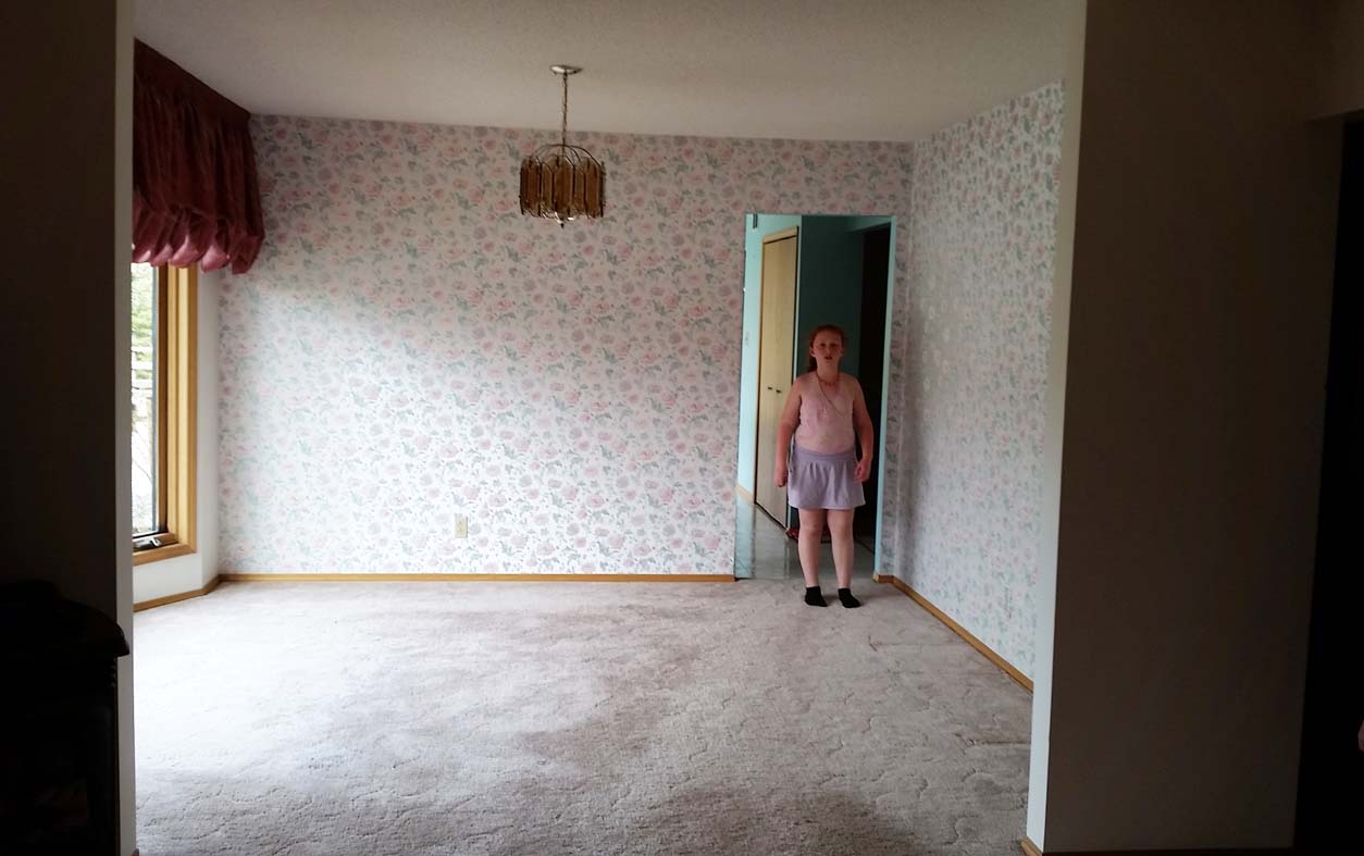 Before we got to re-doing the place, it looked quite different! The living room was a dark pink color and the dining room had a lot of wallpaper — unappealing wall paper.