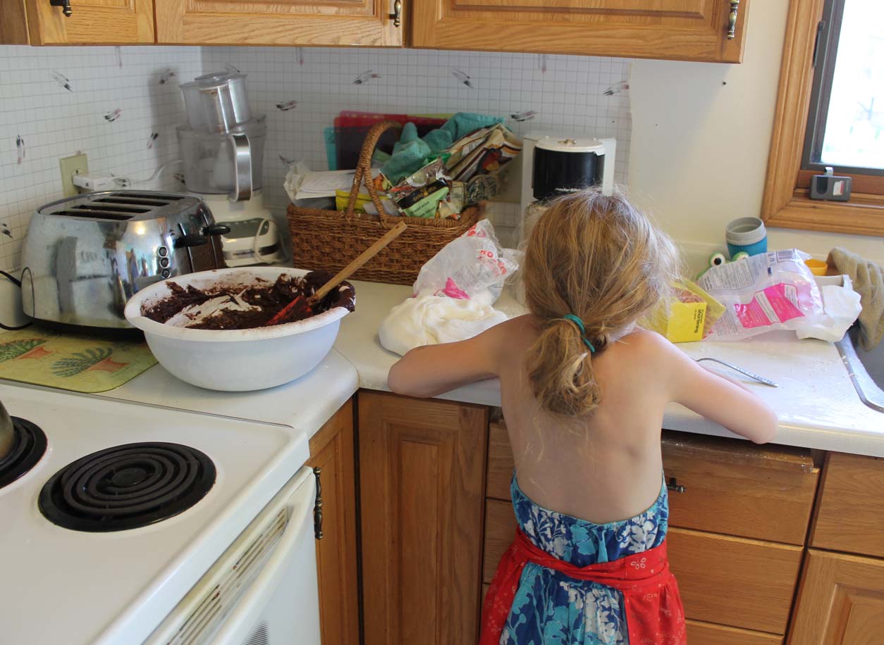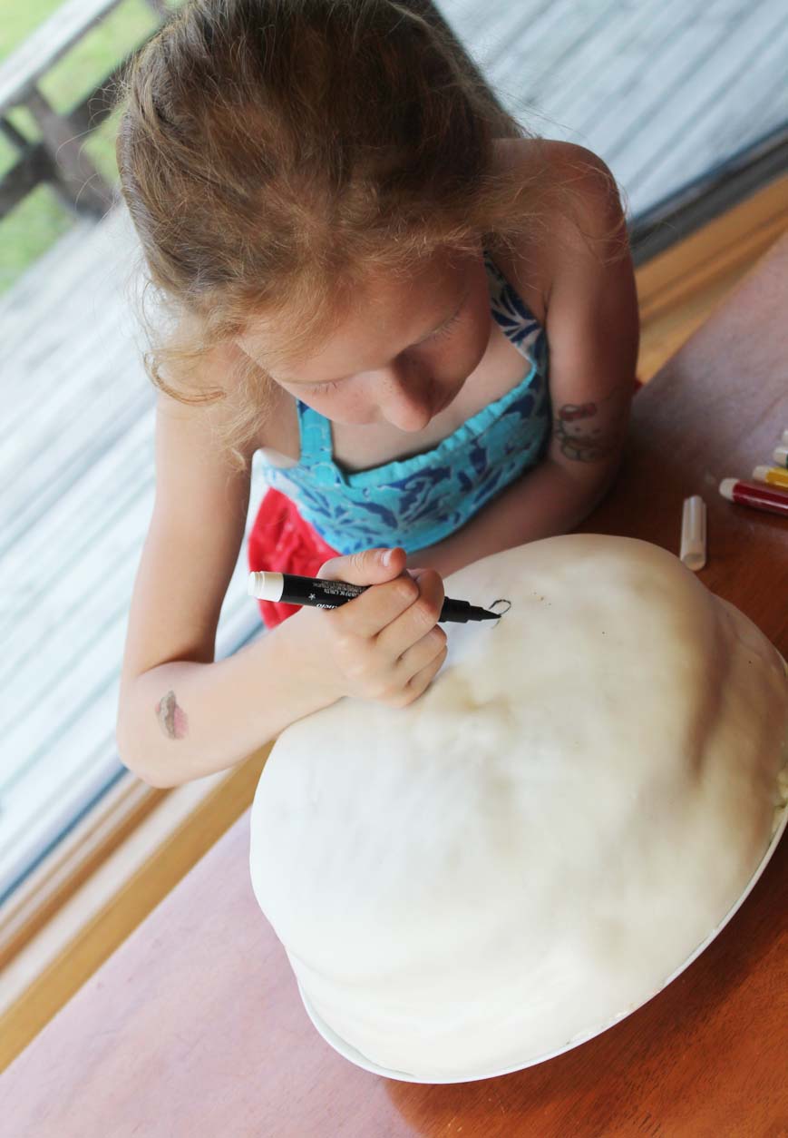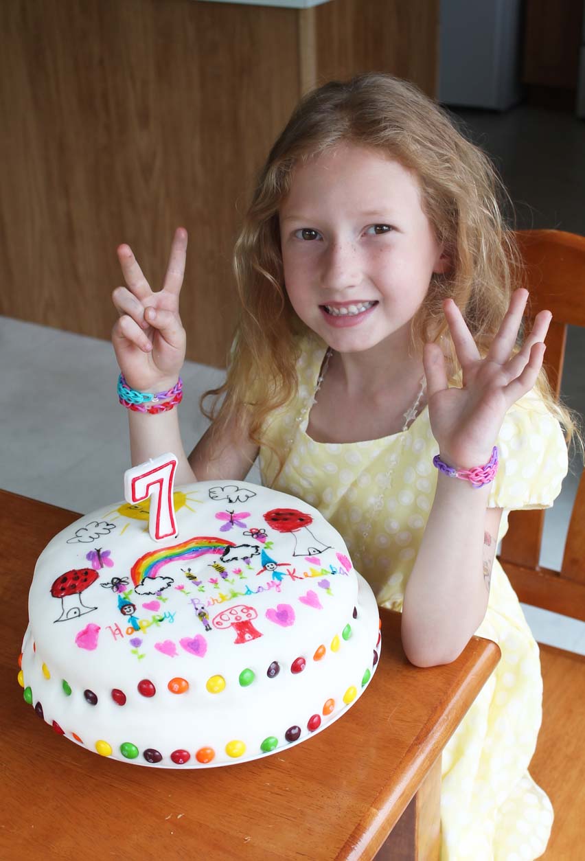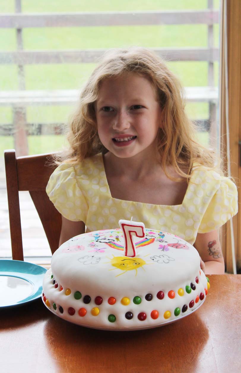 For her cake, I made a Chocolate Banana Cake and a marshmallow fondant. I decided this year to just let her decorate the cake herself using edible markers. She drew a rainbow, flowers, bees, fairies, toadstools, and butterflies.