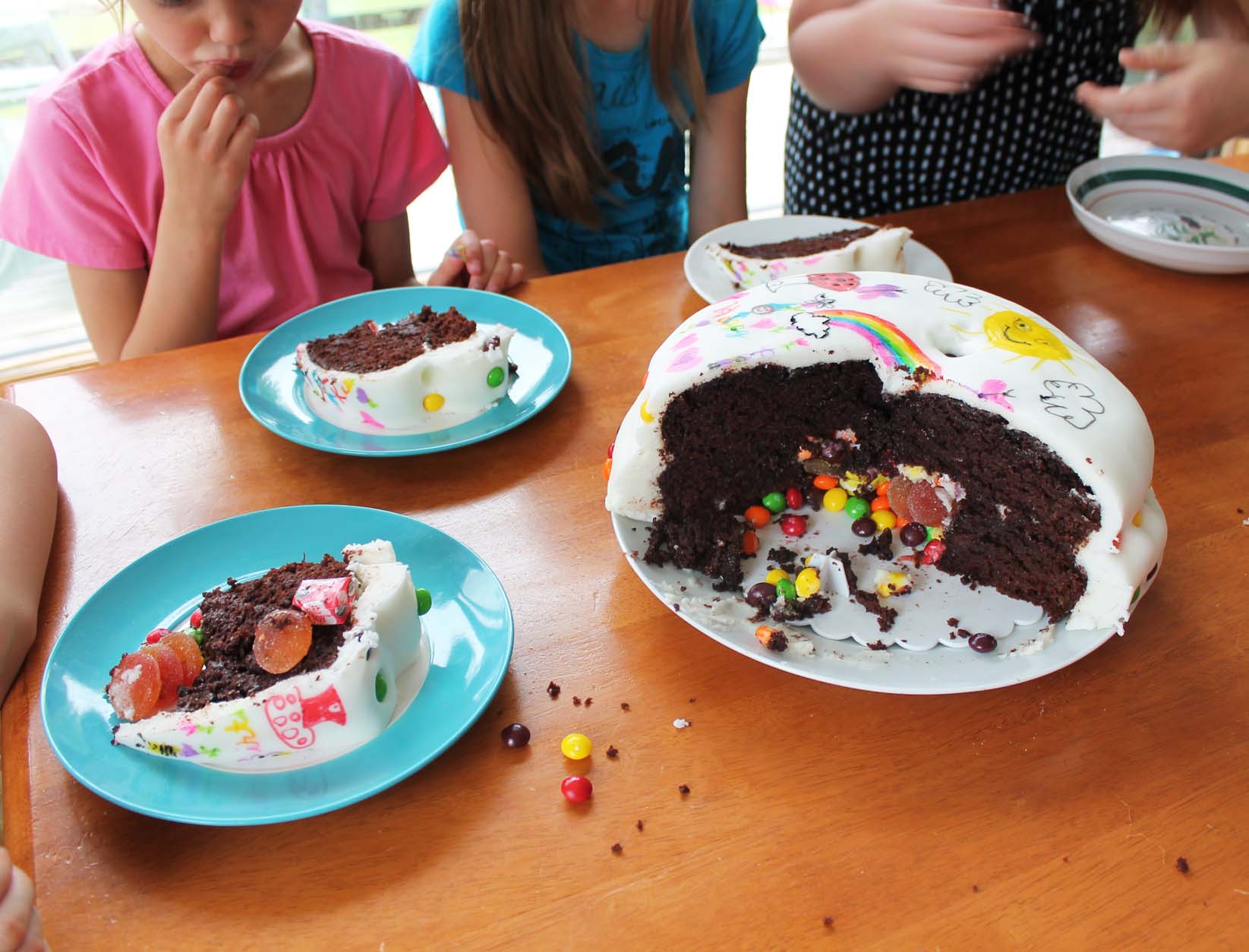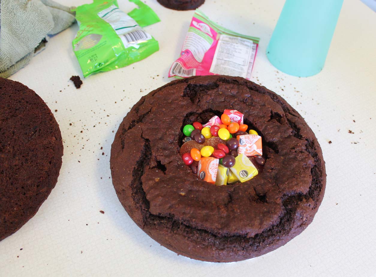 We made the cake a pinata cake and filled it with her favorite candy, Skittles, and some other organic candy.