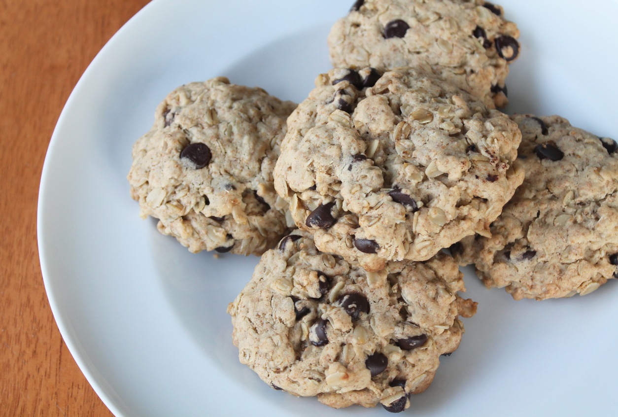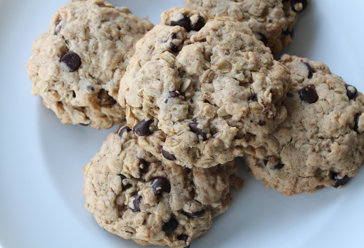 With this cookie recipe, I used rolled oats and spelt flour. The chocolate chips I like to use to sweeten my life are the stevia-sweetened Krisda chocolate chips, but you can use any dairy-free chocolate chips to make these cookies vegan, or use regular chocolate chips if you wish. The cookies themselves are sweetened naturally with pure maple syrup.