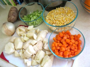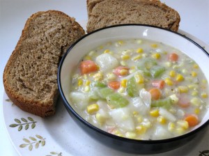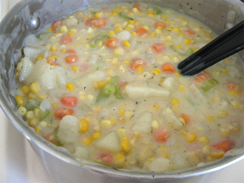 This chowder is creamy and delicious! I decided to make it heartier than a normal corn chowder, by adding potatoes and canned cream corn to make it even thicker. Serve with a slice or two of 100% whole wheat bread and you have one heck of a meal.