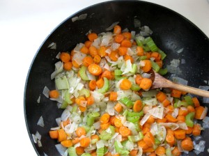 Heat a skillet on medium heat with the 2 tablespoons of olive oil. Add the diced onions, celery and carrots to the skillet and saute 8-10 minutes, until carrots, celery and onions have softened. Add the rosemary, thyme and marjoram if using.