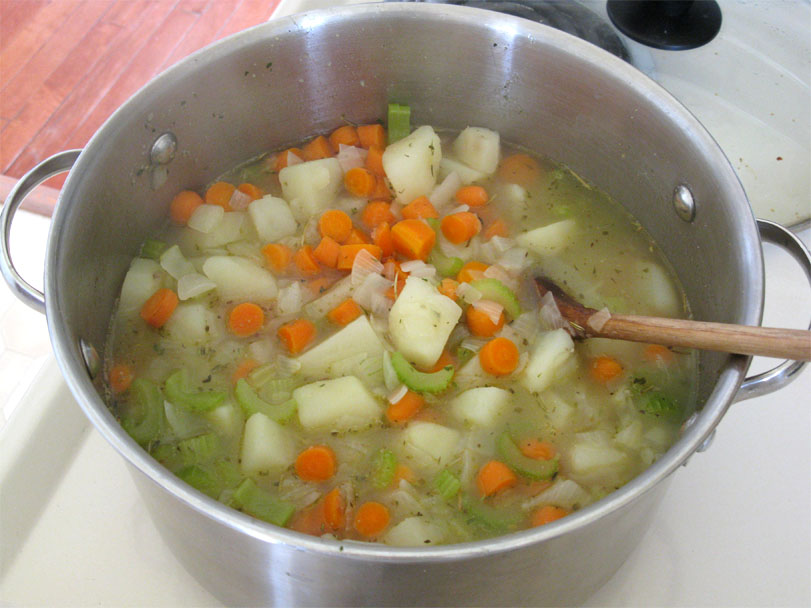 Meanwhile, bring the 4 cups of water to boil in a large pot along with the vegetable bouillon and sea salt. Add the peeled and chopped potatoes and boil for about 8-10 minutes, until fork tender. Once the potatoes have cooked, add in the sauteed vegetables.